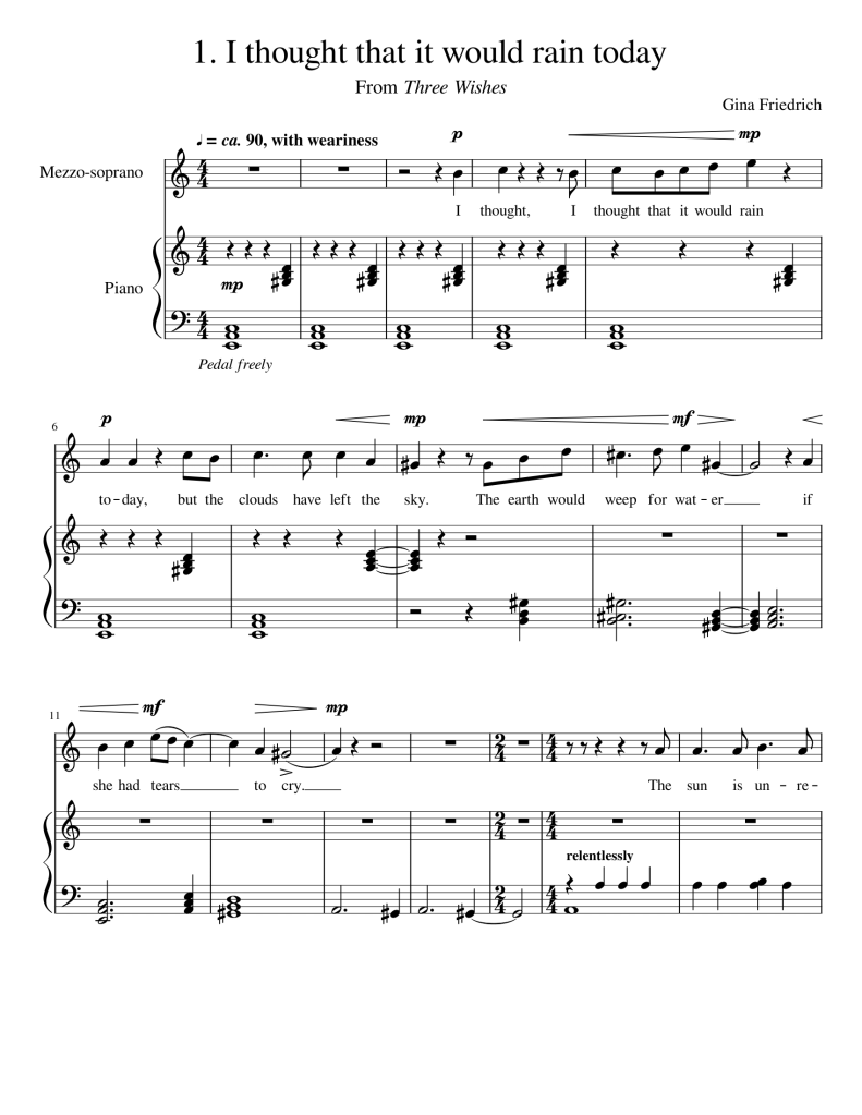 The wish in “I thought that it would rain today” is for relief from pain. The text likens the chronic pain experienced by palliative patients to the unbearable summer heat and pleads for the relief that only the night (or death) can bring. The relentless piano, angular vocal line, and minor key in the first half of the song contrast the flowing, gentle melodies and the major key that evokes the comfort of the night.
