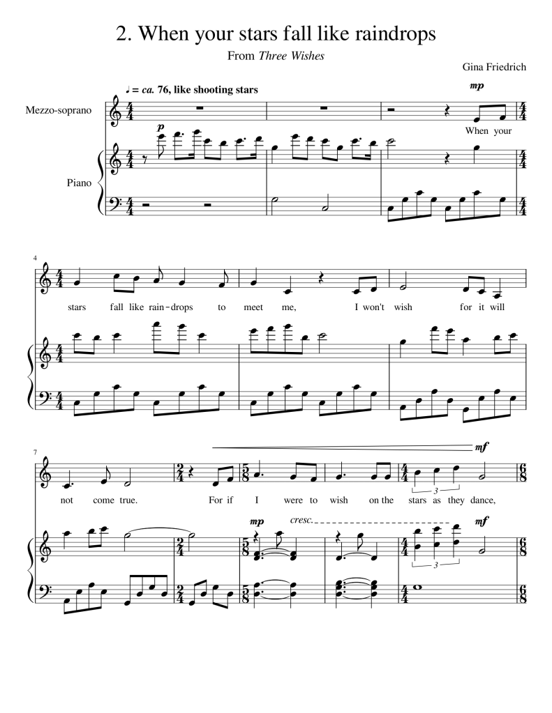 The wish in “When your stars fall like raindrops” is for connection. This song begins with the speaker seeing a sign in the sky from a deceased loved one. As the signs from above slowly dwindle, the speaker hopes that their loved one is still with them, even when they do not see a reminder of them in the sky. At the beginning of the song, the piano is particularly active. Its motion is gradually reduced as the song continues, paralleling how the falling stars disappear.